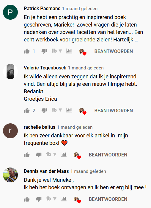 Ik heb Marieke ontdekt op you tube en heb haar boek direct besteld. Als je het leest hoor je haar stem. Geen zweverig gedoe. Je wilt direct alles lezen bij wijze van spreken. Het komt binnen en je kunt er daadwerkelijk wat mee. Dit boek is totaal anders als de vele “hulpboeken” die ik gelezen heb of waar je na 1 hoofdstuk denkt laat maar. Dus dit boek veranderd je leven maar je moet het zelf toepassen. Super Marieke.